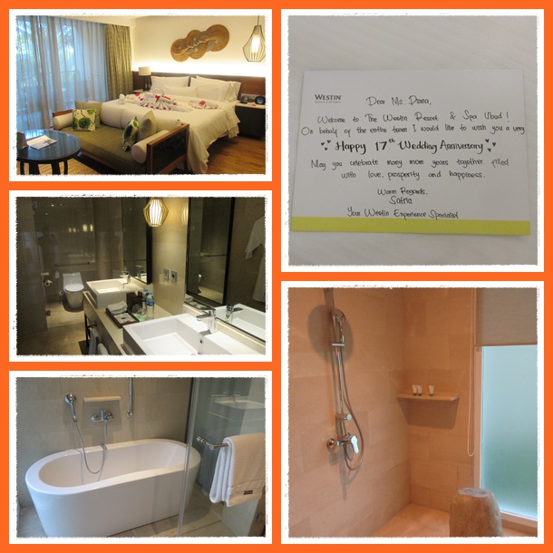 Kami sempat info mengenai moment wedding anniversary ke-17 dan mereka bilang akan memberikan compliment dekorasi di kamar. Betul saja, ada hiasan handuk di ranjang dengan kelopak2 bunga merah seperti pada umumnya untuk honeymoon set up. Yang menarik adalah adanya kartu ucapan anniversary yang ditulis tangan oleh pihak Westin. Thank you so much.Satu hal lagi yang istimewa, yang mungkin mereka tidak sadari adalah nomor kamar 522 yang diberikan kepada kami, melambangkan bulan dan tanggal pernikahan kami. Ini berarti hadiah dari Tuhan buat kami melalui Westin ya, hehe..
