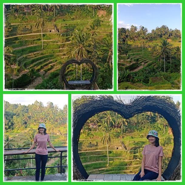 Yang masih ada yaitu spot foto berbentuk hati dengan background sawah. Spot foto tersebut diberi pagar dan digembok. Kalau mau foto, kita harus membayar Rp.10.000 ke Bapak tadi dan bisa berfoto sepuasnya di situ. Melihat Jennifer datang sendirian, beliau menawarkan apakah mau dibantu memotretkan ? Tentunya dengan HP Jennifer ya. Tentu saja Jennifer mau, langsung deh dijepret berkali-kali sampai puas. Bahkan bukan hanya di spot foto itu saja, tapi juga di beberapa titik lainnya hehehe… Serasa punya fotografer pribadi nih. Si Bapak juga senang kali ya ada kegiatan, karena memang sepi sekali di sini, tidak ada pengunjung lain.
