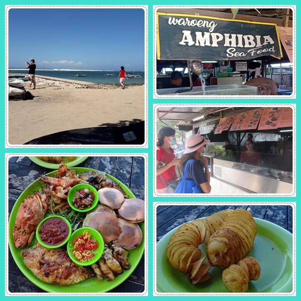 Sebenarnya warung ini punya banyak menu, tapi seperti pengalaman Diana terdahulu, kami pilih menu platter yang untuk 2 orang saja. Sudah campur semua : ada kerang, ikan, udang, cumi, plus kepiting kecil. Semuanya fresh ! Ditambah nasi/kentang lengkap dengan sayur dan sambal. Komplit. Harganya masih Rp.200.000 loh per porsi untuk 2 orang itu. Enak banget dan puas banget untuk kami ber-3 makan. Tinggal tambah nasi Rp.5.000 per porsi. Kentang goreng nya di sini unik, dipotong spiral tidak terputus gitu (lihat foto), crispy dan enak banget. Mesti coba ya. Over all, buat kami makan seafood di sini jauh lebih worth daripada di Jimbaran, baik dari segi rasa dan juga harga, walau pemandangan nya memang berbeda.