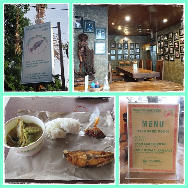 Tempat makan ini cukup terkenal dan sudah banyak public figur yang pernah makan di sini. Foto2nya dipajang di tembok restoran. Nah uniknya di restoran ini menunya hanya 1 macam aja, tinggal pesan mau berapa porsi. Satu porsi itu terdiri dari : nasi putih, ikan goreng (tidak pedas) dan sup ikan (dengan bumbu asam pedas) plus sambal. Semuanya ikan laut ya. Harga per porsi Rp.55.000. Bisa makan di tempat atau dibungkus. Kami pilih dibungkus saja untuk dimakan di teras cottage. Jika dibungkus, silakan siapkan tas sendiri untuk membawanya atau harus beli tas kain Mak Beng yang lumayan kecil sih ukurannya. Maksimal 3-4 porsi sepertinya untuk 1 tas kain Mak Beng.