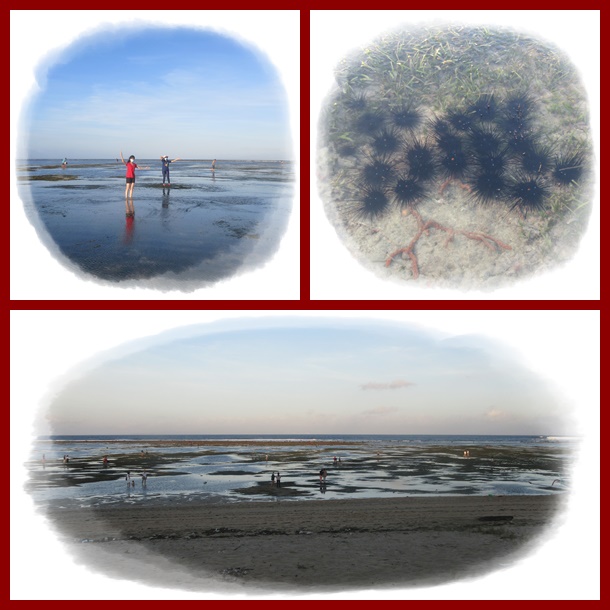 Saat sore hari, air laut surut dan kita bisa jalan2 hingga jauh ke tengah lautan, jauh dari pantai. Kok bisa ? Iya, karena ternyata lautnya dangkal dan banyak batu2an serta rumput laut di dasarnya. Saat air laut surut, jadinya yang terlihat adalah bongkahan2 karang di dasar laut dan rumput2 laut. Kita tinggal menginjak batu2 karang dan rumput laut tersebut, terus menyusur sampai ke tengah laut. Banyak sekali orang yang berjalan di atas laut ini pada sore hari.