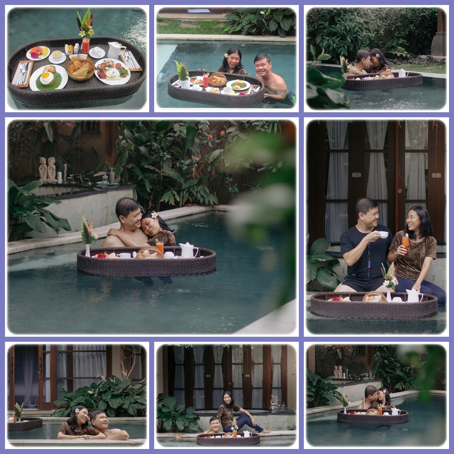 Kami belum pernah ke area Ubud, paling jauh terakhir hanya sampai ke Bali Safari Gianyar saja. Jadi kali ini kami mau menikmati Ubud yang terkenal dengan keindahan alam dan sawahnya. Ada juga cerita keseruan kami menikmati sungai Ayung dengan rafting. Untuk Bali Safari, sekarang giliran Jennifer yang pergi ke sana. Di Ubud kami sempat menginap di Westin Resort & Spa, dimana kami bisa belajar aqua yoga dan pakai kostum baju Bali. Kami juga menginap di Nyuh Ubud, villa dengan private pool dan berfoto pre-wedding anniversary dengan nuansa floating breakfast. Mantap !