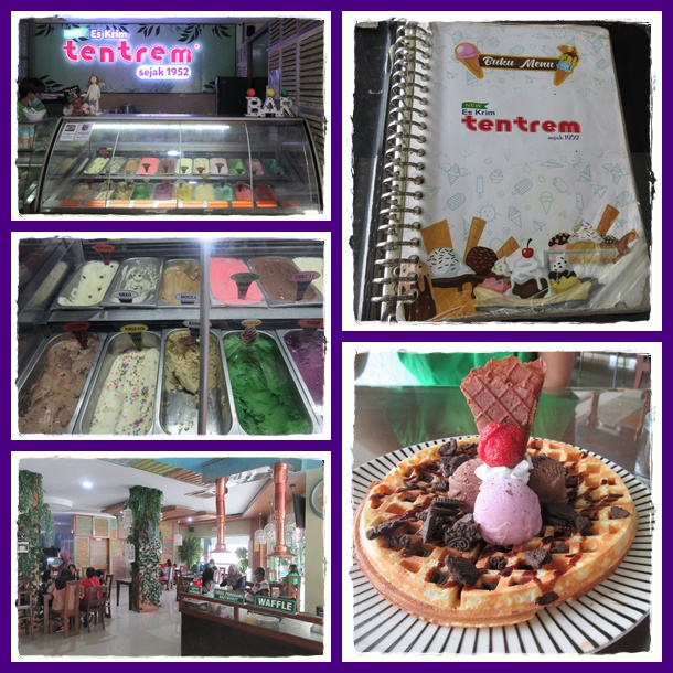 Setelah check-out hotel, mampir dulu ke New Es Krim Tentrem. Ini es krim legenda nya Solo, Sudah ada sejak tahun 1952. Lokasinya tepat di belokan yang terletak di antara persimpangan jalan Slamet Riyadi dan jalan Diponegoro. Di sini pilihan rasanya banyak sekali ya. Ada rasa buah-buahan dan ada juga yang unik, seperti rasa anggur, pisang, mangga, durian, jambu, melon, blueberry, mentos, bubble gum, tiramisu, green tea, taro, dsb. Kami pesan 1 Belgian Waffle Ice Cream (waffle dengan 3 scope ice cream aneka rasa) dan 1 tutti frutti. Waktu wafflenya datang, kami kaget karena ukuran scope ice cream nya sangat kecil. Jadi bukan ukuran scope es krim normal untuk cone gitu ya. Setengah atau sepertiganya lah kira-kira, haha… Dikasi air putih gratis, ini juga gelasnya mini banget, kaya gelas sloki gitu.