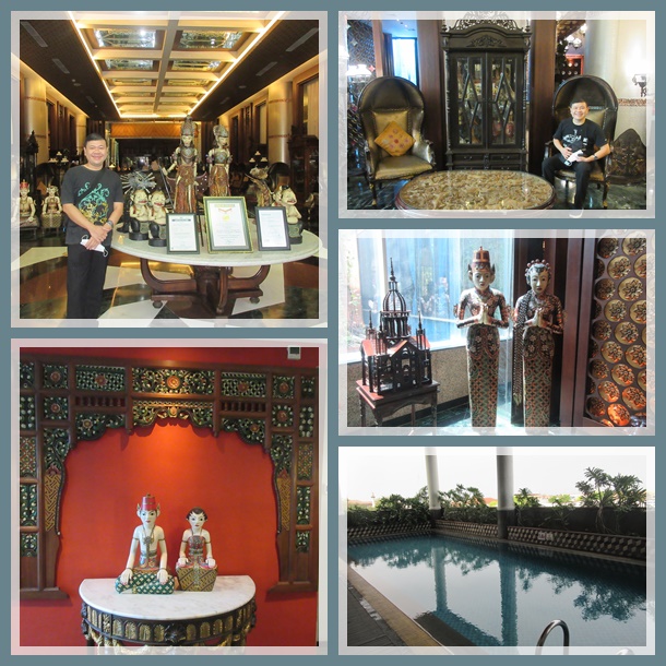 Dari situ, kami lanjut untuk check-in di hotel The Royal Surakarta Heritage-MGallery Collection. Ini adalah salah satu hotel bintang 5 yang ada di Solo, yang kami pilih karena nuansa tradisional nya. Cari yang tidak ada di Jakarta dong ya. Interiornya sangat luar biasa, seperti di gallery betulan deh. Baik di lobby hotel, lorong2 hotel, bahkan hingga kamarnya, penuh aksesoris bernuansa Jawa seperti wayang, boneka patung pengantin jawa, ukiran etnik, batik, dll. Kolam renangnya semi outdoor, jadi kalo hujan ga kehujanan, menarik sih walau ukurannya cukup kecil.