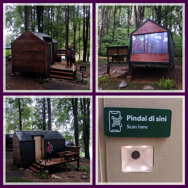 Bobocabin dikendalikan secara teknologi. Untuk masuk cabin, tidak memerlukan kunci manual tapi cukup dengan scan QR Code yang ada di apps. Untung pas scan pintu langsung terbuka. Kami membayangkan kalo pintu macet ga kebuka trus hujan2 begini ga bisa masuk cabin, ribet juga ya. Atau hp pas ketinggalan di dalam cabin, atau hp low bat, trus pintu kekunci, nah looo…