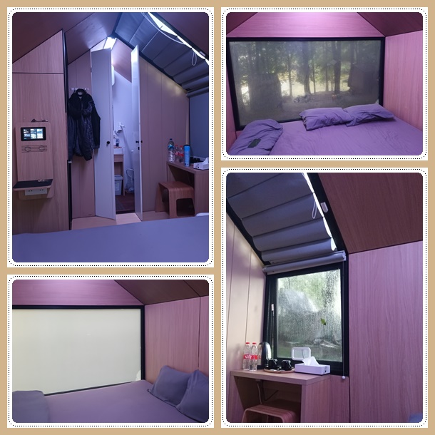 Di dalam cabin tidak ada sakelar lampu. Semua lampu dan kontrol musik bisa dikendalikan di apps atau control panel yang ada di samping tempat tidur. Lampu nya bisa pilih warna: putih, kuning, merah, hijau, biru, atau mau lampu disko ganti2 warna juga bisa. Terangnya juga bisa pilih, mau terang banget (100%) atau mau temaram (10%), silakan saja. Tersedia musik relaksasi suara air sungai dan kicau burung jadi serasa di hutan betulan. Kalo mau sambung bluetooth ke hp untuk dengar musik lain juga bisa. Yang kaca utama tidak pakai tirai untuk menutupnya, tapi cukup tekan tombol maka jendelanya akan berubah menjadi seperti kaca es yang gelap/tidak tembus.