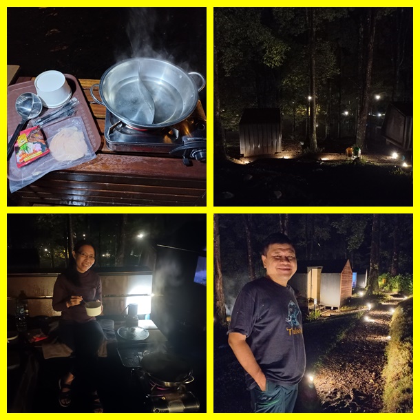 Saat malam tiba, lampu2 jalanan mulai dinyalakan dan memberikan kesan romantis. Cuma tetap termasuk gelap ya, jadi kalo mau jalan malam hari mesti bawa lampu sendiri atau pakai senter hp tapi jadi minimal banget penerangannya. Malam ini, kami mau makan chicken steamboat yang bisa dipesan ke resepsionis. Harga Rp.100.000,- sudah lengkap dengan bumbu, peralatan masak dan peralatan makan seperti di gambar. Juga dipinjamkan lampu sorot LED yang terang banget untuk bisa masak di tengah kegelapan malam. Very good ! Kami juga membawa sendiri tambahan frozen food (fish ball, tofu, dll) serta kwetiauw. Enak nih makan yang hangat2 di tengah udara malam yang dingin ini.