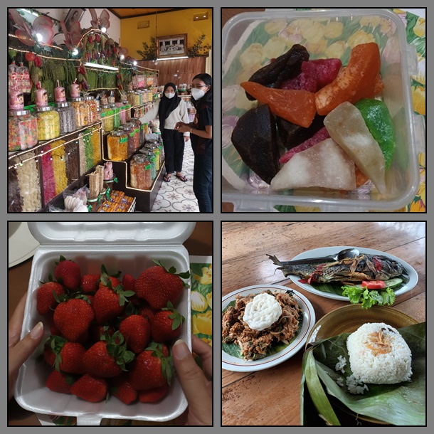 Selain strawberry, ada juga oleh-oleh khas Ciwidey namanya Jeruk Kalua. Ini adalah manisan kulit jeruk yang sudah dikasi pewarna dan rasa yang berbeda-beda (melon, jeruk, gula aren, dsb). Bisa coba dulu di pedagangnya untuk cek kita suka apa tidak. Harganya Rp. 70.000,- per kilo. Kami beli setengah kilo saja sudah dapat banyak, rasanya campur.