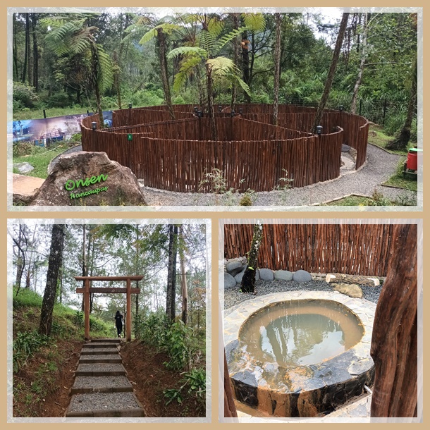 Di Ranca Upas ini juga sebenarnya ada Onsen atau kolam berendam air hangat, seperti yang ada di Jepang. Lokasinya ada di paling depan, sebelah kanan pos masuk pertama, jadi sebelum bayar tiket masuk ranca upas atau saat ini berarti sesudah kami keluar dari gerbang bayar ada di kiri. Kami sudah pengen banget berendam di sini, namun saat sampai tempatnya seperti kurang terawat. Tidak jelas kapan dikuras karena semua tempatnya terisi air penuh dan dipenuhi daun2 berjatuhan.
