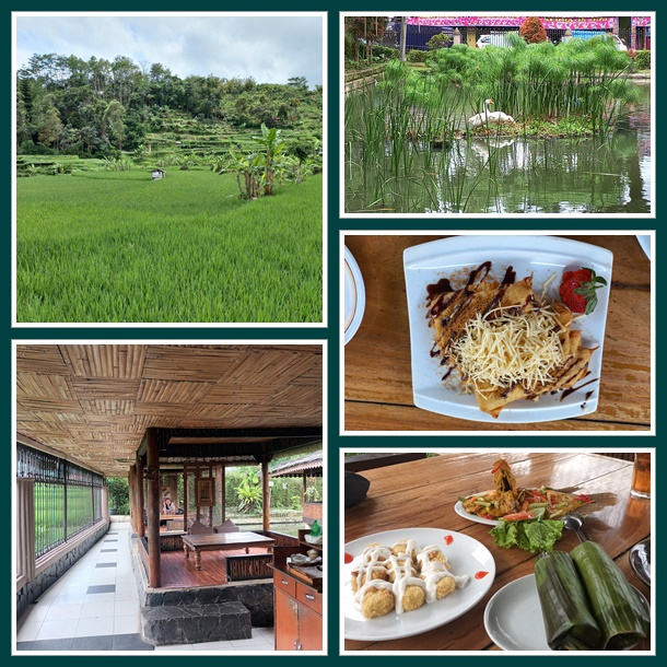 Bisa makan dengan duduk di kursi biasa atau duduk lesehan di dalam saung. Ada pemandangan sawah (serasa di Ubud), ada juga kolam ikan yang luas mengitari restoran. Asik banget ! Makan siang kali ini, kami pesan gurame acar kuning, tahu goreng mayonaise, nasi timbel dan pisang goreng keju. Semuanya enak2, harganya juga sangat terjangkau. Puas banget deh makan di sini, kenyang dan bisa sambil tiduran dengan suasana yang adem ditemani semilir angin.