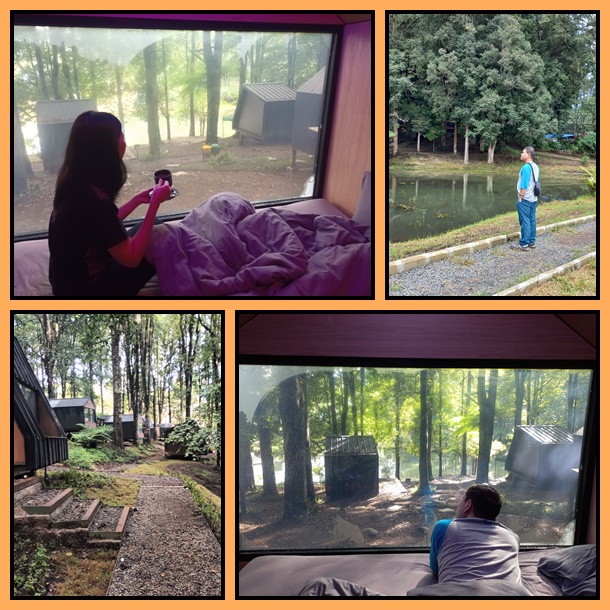 Malam ini di cabin cuaca dingin sekali, karena alami ga bisa kecilkan AC nih. Untungnya disediakan selimut yang tebal dan hangat, selain kami pun pakai baju hangat ya supaya bisa tidur nyaman. Senang sekali bisa tidur malam dengan memandang banyak pohon pinus, serasa camping betulan dan tidur di udara terbuka, cuma dalam kondisi yang nyaman.