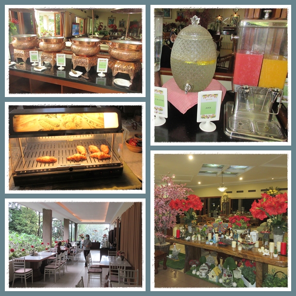 Habis berendam barulah kami lanjut breakfast. Waktu kami ke sini dulu, sarapan ala carte hanya memilih kalo ga salah ingat antara nasi goreng, bubur, dimsum atau american breakfast. Sekarang ternyata disediakan buffet untuk breakfast. Wah, keren banget ! Katanya sih karena jumlah tamunya lebih dari 25 orang, jadi bisa prasmanan. Oke, mari kita nikmati. Jenis makanannya ternyata cukup lengkap, mulai dari stall roti-croissant-pie di bagian dalam restoran, lalu ada omelete, wafel dan sosis di pojokan, serta buffet utama di ujung yang lain. Buffet utamanya terdiri dari : bubur (ini enak banget walau warnanya kecoklatan-ga putih, seperti sudah dicampur bumbu macam2 selain ayam), bakso kuah, cereal + milk, nasi goreng, berbagai lauk daging ayam, sapi dan sayuran, serta spaghetti bolognaise. Ada juga buah potong di dalam chiller (jadi tetap dingin), jus dan teh-kopi yang standar.