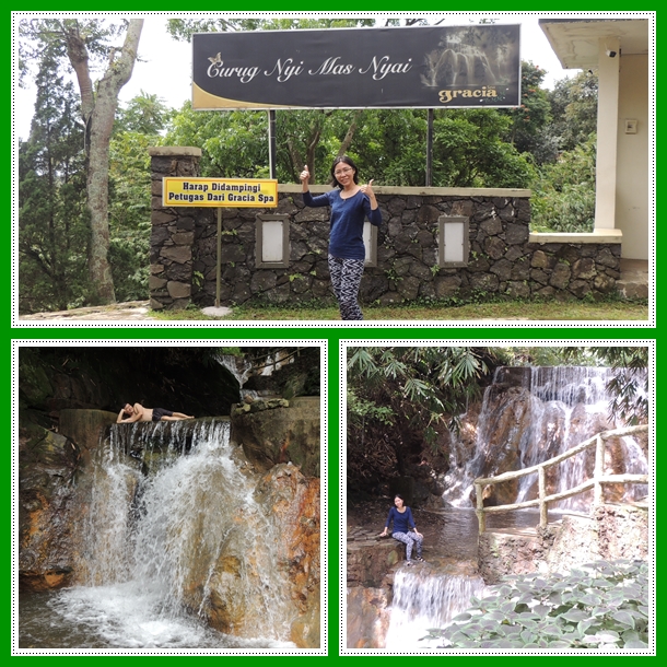 Tiba di curug, kami minta ditinggalkan saja, ga usah ditunggu. Nanti pulangnya bisa jalan kaki lah, kan menurun dan sudah tau arah. Dari pelang curug sampai ke air terjun nya sendiri sangat mudah. Pihak Gracia Spa sudah menyiapkan dan membuat tangga2 yang mudah untuk dilalui para tamunya. Tidak khawatir terpeleset karena ada pegangan tangan.