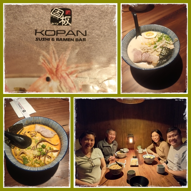 Setelah sore sampai rumah, beres2 koper dan mandi, tau-tau udah diajak makan malam. Eits… perasaan belum lama baru makan, haha.. Oke, malam ini diajak makan Jepang biar beda, nama restonya KOPAN, sushi dan ramen bar di Canyon Point Marketplace. Enak nih makan ramen berkuah dan hangat di tengah2 cuaca malam yang dingin. Di Amerika, porsinya itu biasanya besar, jadi hati-hati kalo pesan makan. Kami coba pesan 1 porsi dulu dan betul saja… isinya banyaaak. Pas untuk kami semangkok berdua, hehe..