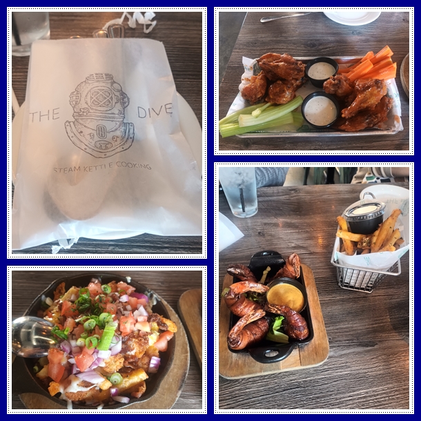 Akhirnya sampai di The Dive https://www.divesteamkettlecooking.com yang berlokasi di Temple City. Tidak jauh dari Walnut City, tempat family kami tinggal. Makanan bertema seafood yang enak ! Karena tadi kami sudah agak kenyang, jadi dipesankan macam2 menu supaya bisa coba2 sebagai cemilan. Ada kentang goreng bumbu cajun, ada yg kentangnya pake keju melted-potongan tomat, ada udang, ada chicken wings, semuanya tasty banget, rasanya kuat-malah ada yang cukup pedas. Cocok deh buat lidah orang Indonesia.