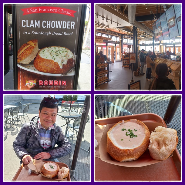 Kalo ke San Francisco, mesti cobain Clam Chowder nya. Ini soup yang banyak sekali dijual di Fisherman’s Wharf. Kami akhirnya pilih Bistro Boudin, bakery yang juga jual makanan ini dan ada supermarketnya juga. Di sini Clam Chowder disajikan dalam Sourdough Bread Bowl, roti keras yang menjadi mangkoknya dan ada rasa asamnya. Harganya USD.12,3 incl tax. Supnya enak banget ini !