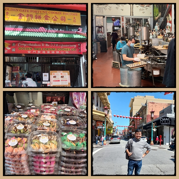 Sehabis makan, kami jalan kaki keliling dengan dipandu oleh Sutan. Salah satu nya ke pabrik fortune cookies, yang masih menjadi tradisi di banyak Chinese food restaurant di Amerika. Lokasinya terletak di gang kecil, di sini kita bisa lihat proses pembuatan fortune cookiesnya plus dikasi sample. Rasa dan warnanya kayak kue semprong kalo di sini. Nah biasanya di dalam fortune cookies itu ada kertas berisi kata2 mutiara/ramalan gitu. Kalo di sini, bisa juga kita tulis sendiri kertasnya dan titipkan ke orang yang buat untuk dimasukkan ke dalam kue nya. Hihi..