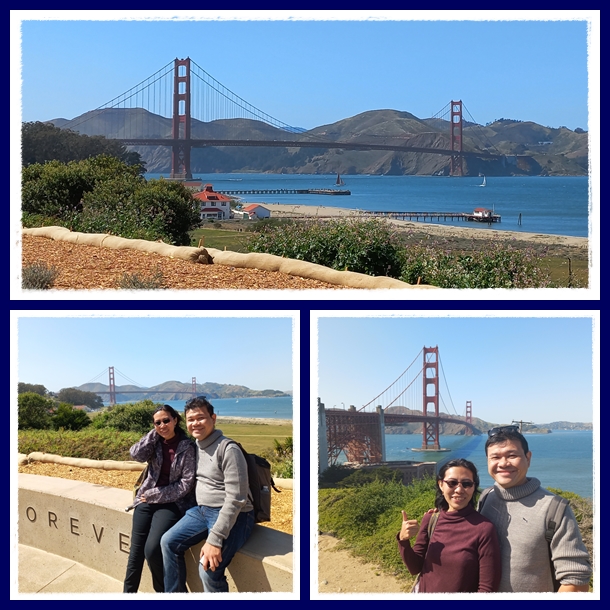 Dari sini kami mau mulai foto2 dengan background Golden Gate Bridge (yang tidak berwarna golden tapi merah). Untuk view ini, kita bisa mengarah ke Presidio Promenade. Di situ banyak trail yang bisa membawa kita melihat Golden Gate dengan jelas. Jika naik public transport, disediakan juga bis gratis untuk ke Presidio, cek di https://www.presidio.gov/transportation/presidigo