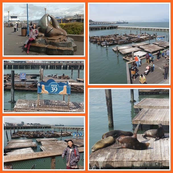 Pier 39 adalah tempat melihat Sea Lion, salah satu tempat yang paling ramai oleh turis. Banyak orang nonton tingkah laku mereka yang lucu2. Jumlahnya puluhan, ada yang besar, ada yang mungil, pada tidur2an dalam pallet2 kayu terapung. Ada juga yang main dorong2an dan cebur2an, haha… Orang yang senang binatang seperti kami, pasti butuh waktu lama di sini
