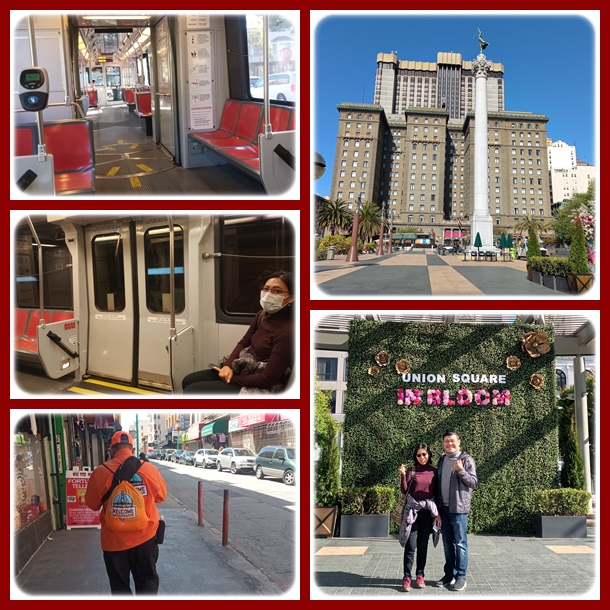 Dari rumah, kami jalan kaki 3 menit ke depan Lakeshore Plaza. Di situ ada halte bus untuk naik bis no.58. Seterusnya bisa gunakan google maps saja. Kami turun di satu tempat dan kemudian naik metro/train hingga Powell Station. Jadi mudah sekali nih mencapai pusat kota SF dari rumah sementara kami. Dari sini jalan kaki ke Union Square ga jauh.