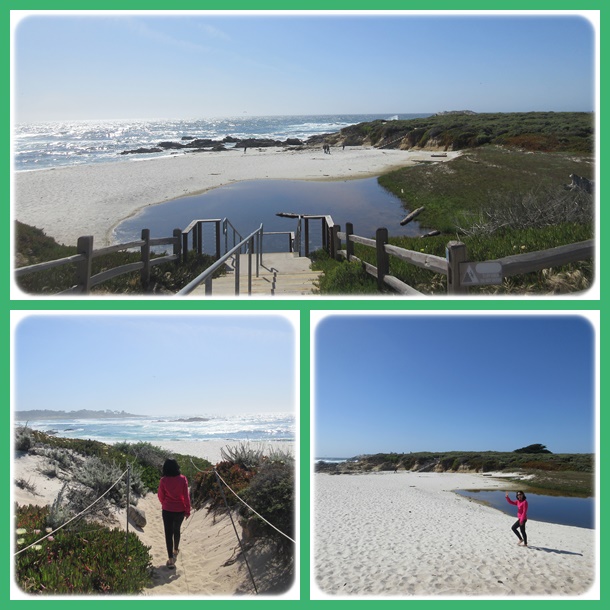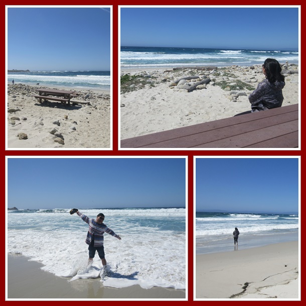 Oke, perjalanan seru dimulai ! Kami berusaha untuk stop di setiap stop point itu. Nomor 1 dan 2 itu berupa bukit yang bisa memandang Monterey Bay dan Santa Cruz. Cuma sebentar di sini karena biasa aja sih menurut kami. Nomor 3 ini baru keren banget, pantai pasir putih yang ada picnic table nya. Kami sempat snack di sini sambil menikmati pemandangan laut biru. Karena penasaran, kami pun coba jalan masukin kaki ke laut yang dingiiin itu… seru juga nih. Bahkan pas foto2, baju Jeff sempat basah kena hempasan ombak, hihi..