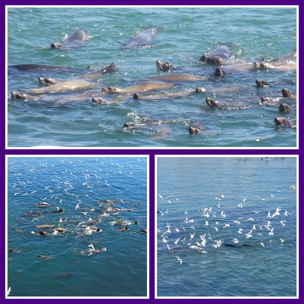 Wah, keren banget ini. Pemandangan yang spektakuler ! Kalo di Pier 39 San Francisco kemarin sea lion nya hanya tiduran di dek, yang ini aktif berenang di lautan. Jadi betul2 seperti melihat hewan di habitat aslinya. Kemana pun sea lion berenang berkelompok, di atasnya ada burung2 yang juga berkelompok mengikuti. Duuh… seneng banget lihatnya. Mana mereka juga mengeluarkan suara berisik ngok ngok khas sea lion, lucu banget.. Kami cukup lama di sini nonton show gratis yang alami dari mereka, rasanya ga rela harus meninggalkan dermaga ini. Huhu…
