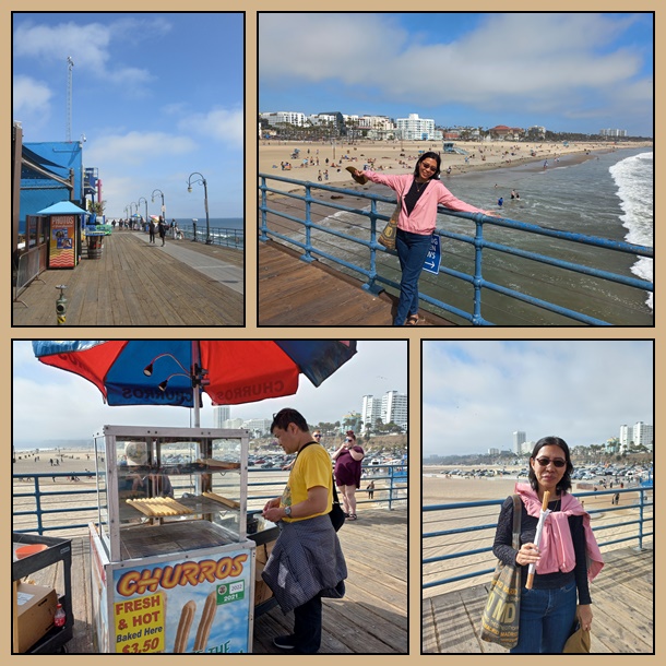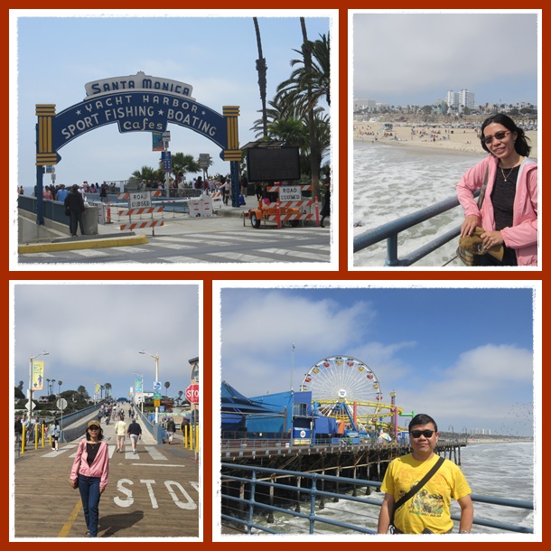 Kami kemudian jalan kaki ke arah pantai dan memang itu adalah tempat khusus pejalan kaki bisa jalan2 di dermaga Santa Monica. Di kanan kiri banyak toko, cafe, ada juga street performance, seru sih. Di salah satu pojokan dermaga, itu ada taman bermain (amusement park) dengan ferris wheel, jet coaster, dll. Mirip dufan mini deh.