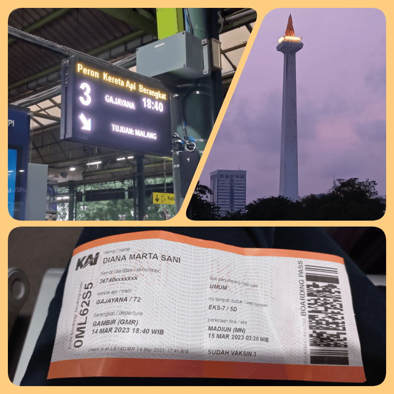 Perjalanan ini menjadi salah satu perjalanan yang berkesan bagi Diana, karena Diana belum pernah pergi sendirian naik kereta api ke destinasi sejauh ini. Diana naik kereta api domestik terjauh itu sampai Semarang, itu pun dengan teman kantor dulu urusan pekerjaan. Kalo sendirian paling pernahnya naik kereta Jakarta-Bandung aja. Mana naik kereta malam yang sampai di tujuan subuh, ke tempat yang belum pernah dikunjungi. Butuh nyali tersendiri untuk melakukan perjalanan ini sebetulnya.