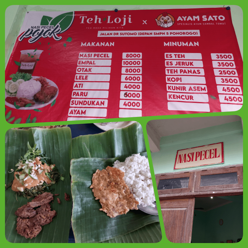Setelah dijemput, Diana diajak sarapan nasi pecel “Pojok” yang katanya legendaris di Ponorogo. Harganya bikin kaget orang Jakarta. Nasi dengan pecel dan tempe hanya 8 ribu saja. Tambah empal 10 ribu, total 18 ribu sudah kenyang ! Bumbu pecel di sini hanya 1 macam dan pedas. Jadi untuk yang tidak suka pedas, bisa minta dipisah saja bumbunya. Alas makanan nya pun masih pake daun pisang, otentik.