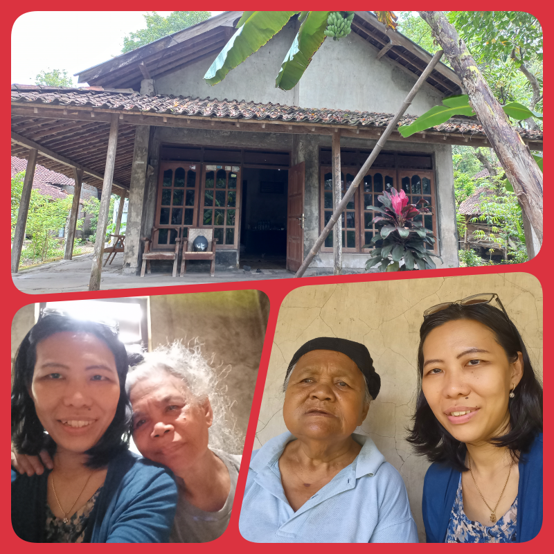 Nah, akhirnya sampai ke tujuan. Di rumah ini tinggal 2 kakak-adik, yaitu Bu Katinem (kakak) dan Bu Semi (adik). Mereka hidup berdua saja karena memang tidak ada suami/anak. Bu Semi ini dulu pernah kerja membantu di Bandung, di keluarga kakaknya mama Diana. Jadi Diana juga kenal baik dengan beliau. Bu Semi juga pernah terkena stroke dan sekarang sudah kesulitan untuk jalan keluar kamar. Jadi aktivitas sehari-hari dihabiskan di ranjang saja. Kalo Bu Katinem walau pernah kena stroke tapi terus berlatih jalan, sehingga sekarang sudah cukup sehat dan masih bisa jalan perlahan dengan bantuan tongkat.