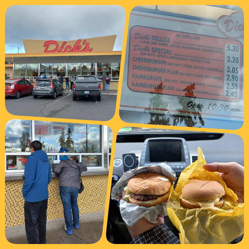 Siang hari kami mau jalan2 keliling Edmonds naik mobil sama Yuswan, sepupu Diana. Mau jajan dulu nih, cobain Dick’s. Ini burger yang selalu rame di Seattle. Mirip model burger In-N-Out yang terkenal di negara bagian California (lihat USA part 4 – Yosemite National Park (California) : 29-30 April 2022). Cuma konsep Dick’s ini adalah take away, jadi mereka tidak menyediakan tempat untuk makan di tempat. Jadi mulai pesan, bayar, hingga mengambil makanan lewat counter saja. Biasanya orang makan di mobil di tempat parkir, oke.. kami ikutan deh. Kami order burger Dick’s Special (burger daging tanpa cheese), Cheeseburger, french fries dan chocolate float. Cheese nya enak banget nih, melted banget di cheeseburger nya.