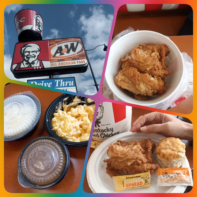 Isi family combo itu ada 8 pcs ayam, 4 biscuit (semacam roti asin bentuknya spt muffin), mashed potato + gravy, serta mac & cheese. Ternyata ukuran ayam originalnya sangat besar, lebih besar dari telapak tangan kita, liat aja di gambar. Sekitar 2-3 kali lebih besar dari ukuran KFC Indonesia. Jadi agak serem ya makannya. Mashed potato dan mac & cheese juga ukuran besar ya, bukan untuk 1-2 orang yang biasa kami tahu selama ini. Rasanya ayamnya menurut kami lebih asin daripada KFC yang di LA. Mac & cheese nya enak ! Gravy mashed potato nya juga standar enak seperti biasa. Karena ini memang porsinya untuk banyak orang, jadi kami hanya makan sedikit dan lebihnya dibawa pulang buat rame2.