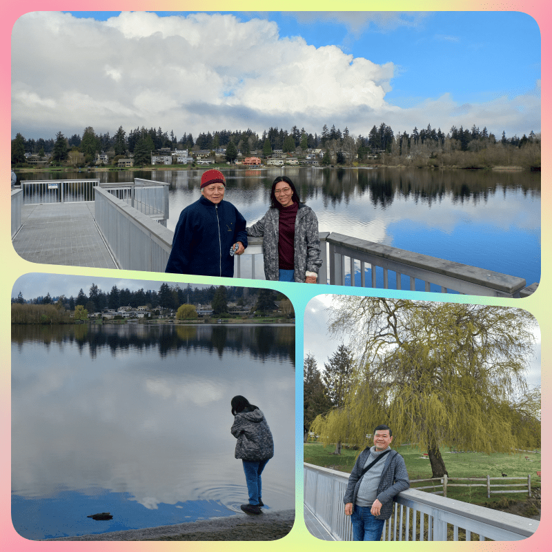 Kami jalan kaki menuju Lake Ballinger, sekitar 30 menit lah. Adanya di area Mountlake Terrace. Perjalanan melewati perumahan penduduk yang asri. Sepanjang perjalanan tidak banyak orang yang kami temui. Kami bersyukur cuaca pagi ini sangat cerah. Air danaunya yang tenang dan matahari yang bersinar, membuat bagus foto2 kami di sana. Banyak juga burung dan angsa liar yang kami temui, senang lihatnya. Setelah bersantai sejenak di sini, kami pun kembali jalan pulang melalui jalur yang berbeda.
