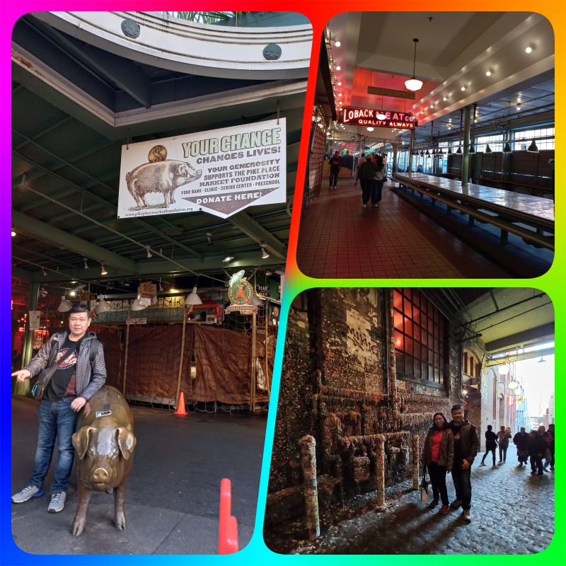 Jam segini ternyata Pike Place Market di sebrang Starbucks ini juga sudah tutup. Jadi ga ada lagi yang berjualan, sepi dan gelap. Berarti memang harus pagi2 ya kalo mau ke market ini. Ada patung babi terbuat dari logam yang namanya Rachel, ini ikon Pike Place Market. Ada bolongannya seperti celengan babi gitu, kita bisa donasi kalo mau.