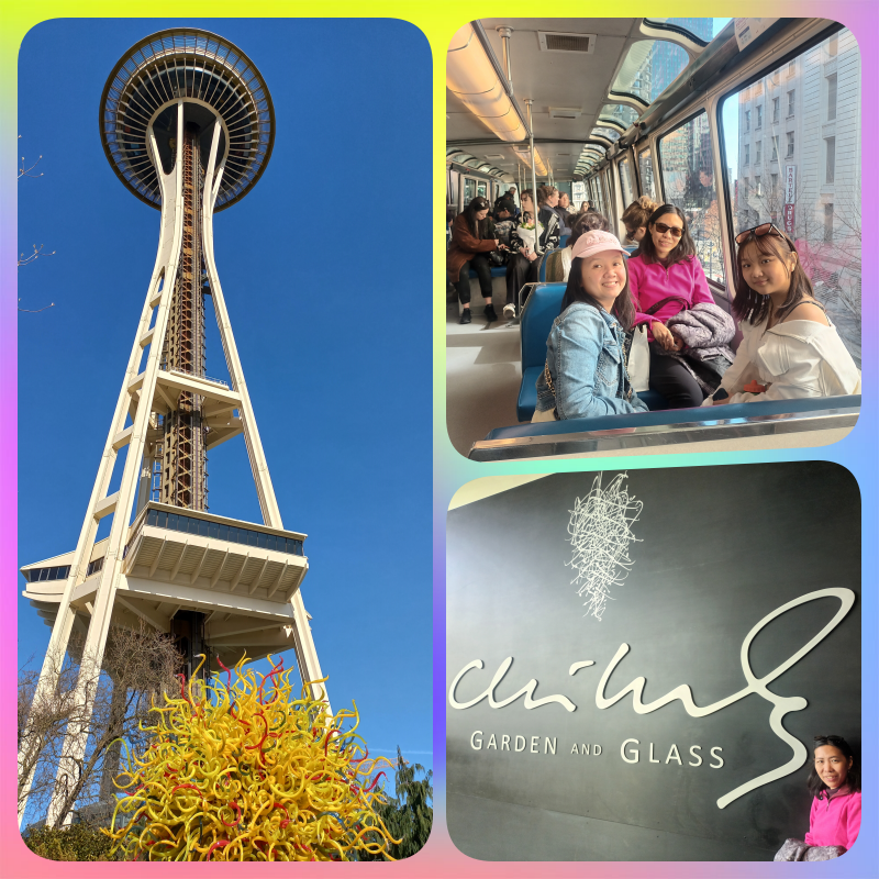 Monorail ini memang hanya menghubungkan downtown Seattle (Westlake Mall) dengan Seattle Center bolak balik ya. Ga ada rute lain. Perjalanannya sangat singkat, tidak sampai 5 menit. Di Seattle Center ada 2 tempat yang mau kami kunjungi yaitu Space Needle serta Chihuly Garden and Glass yang lokasinya bersebelahan.