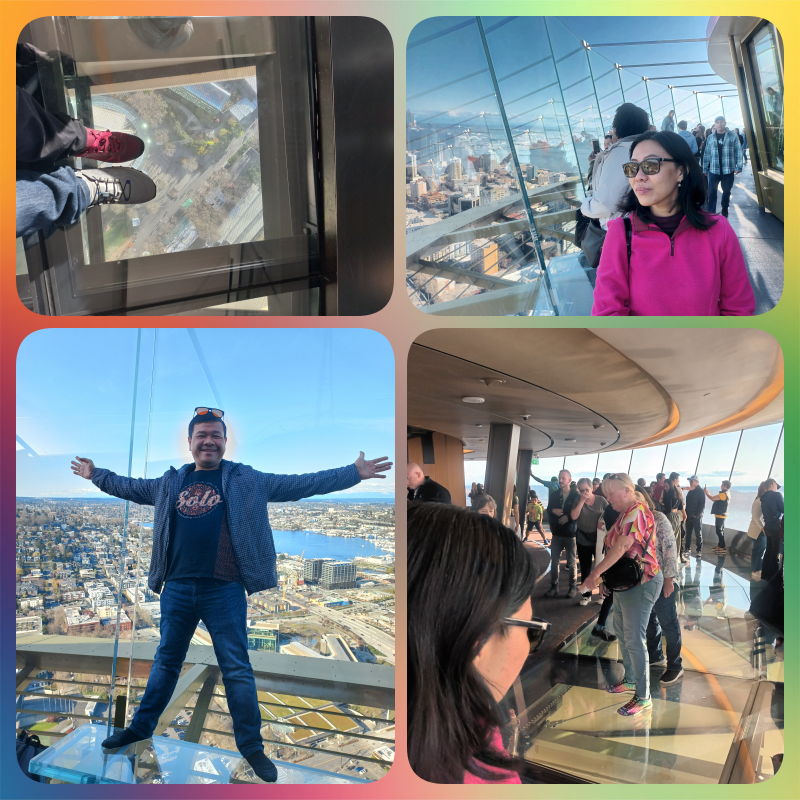 Di atas, sudah banyak orang yang berfoto dan menikmati pemandangan. Ada area dalam dan luar. Di bagian dalam, ada cafe, tempat memilih foto dan lain2. Sedangkan di bagian luar, kami bisa menikmati pemandangan 360 derajat dan melihat kota Seattle maupun pegunungan di sekelilingnya. Wah ga nyesel naik ke sini. Kami memutari Space Needle sambil berfoto dengan berganti latar belakang. Berfoto di atas sini cukup seru karena keseluruhannya dindingnya terbuat dari kaca.