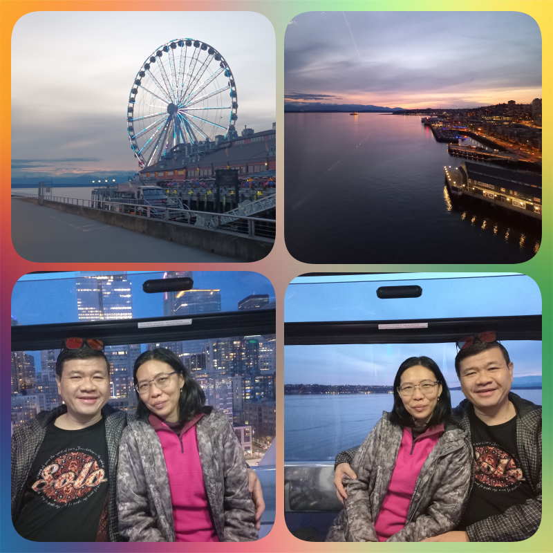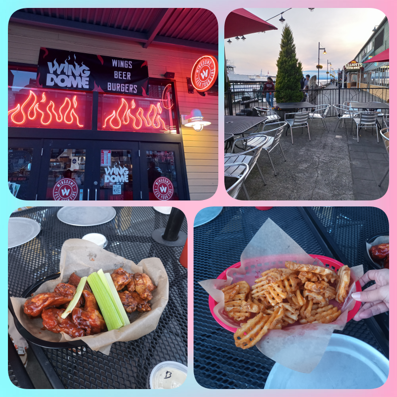 Tujuan terakhir kami malam ini adalah naik Seattle Great Wheel, bianglala yang juga salah satu ikon wisata kota Seattle. Cuma sekarang hampir jam 8 pm dan kami lapar. Tadinya mau cari makan dekat market tapi kan ternyata udah pada tutup. Mengarah ke pier dekat2 Great Wheel juga ternyata udah pada tutup loh tempat makannya. Akhirnya nemu yang masih buka (walaupun ini juga udah mau tutup di jam 8 malam), namanya Wing Dome yang terletak di Pier 56. Tempatnya lumayan enak, ada outdoornya bisa lihat laut. Makanannya simple dan enak. Sip lah.