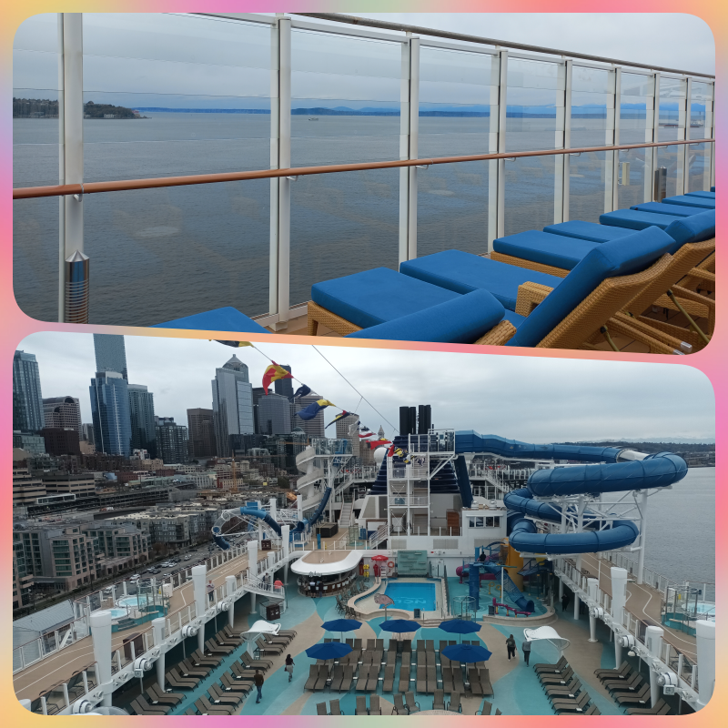Menjelang Bliss Sail Away Celebration atau cruise berangkat jam 17.15, para tamu mendekati dan berkumpul di area kolam renang. Perayaaannya mirip dengan waktu kami cruise di Singapore, tapi kali ini tidak ada bunyi horn kapal yang menjadi penandanya. Perlahan cruise meninggalkan Seattle yang indah sore itu. Buat tamu2 yang senang aktivitas dance, ada acara di panggung pojokan kolam renang berupa nyanyi, dance dan bagi2 hadiah.