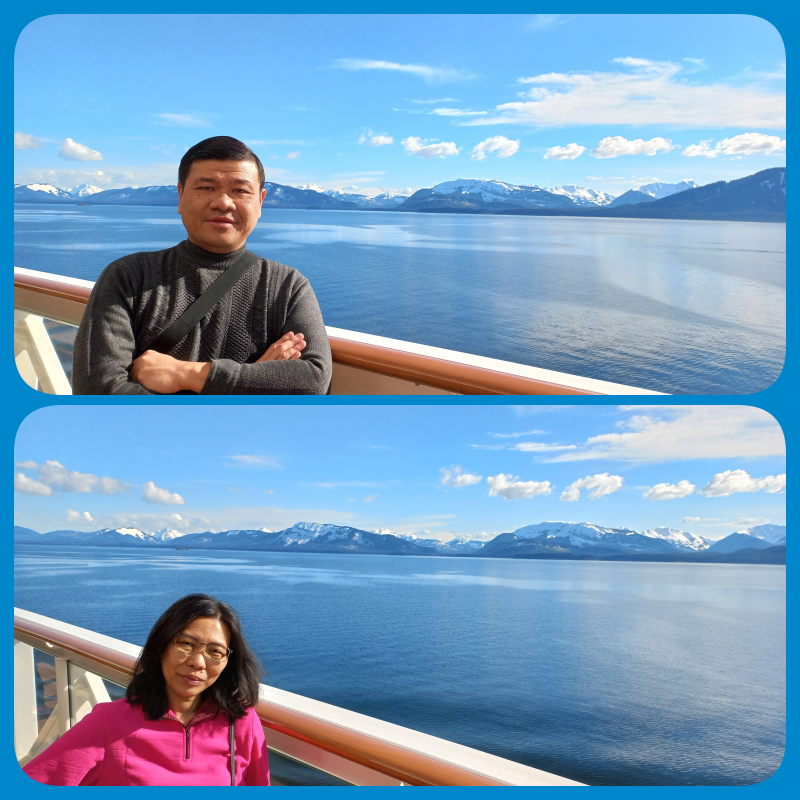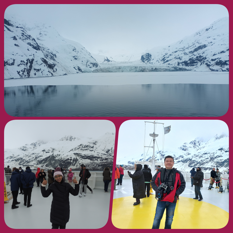 Jam 10 pagi kami dengerin presentasi tentang Alaska di Bliss Theatre. Ada petugas yang jelasin dan diputerin juga video tentang Alaska. Cuaca hari ini cerah sekali. Kami senang jalan2 di Waterfront. Ini terletak di sisi kiri dan kanan cruise, open area lt.8. Ada banyak tempat duduk maupun sofa2 yang nyaman untuk lihat pemandangan. Bisa merasakan dinginnya cuaca dan kencangnya terpaan angin laut.