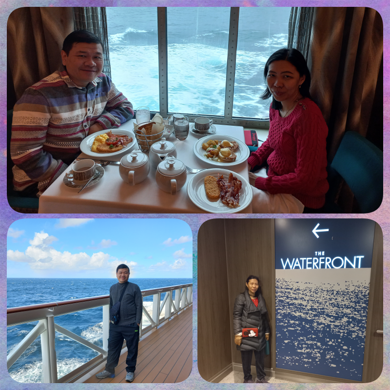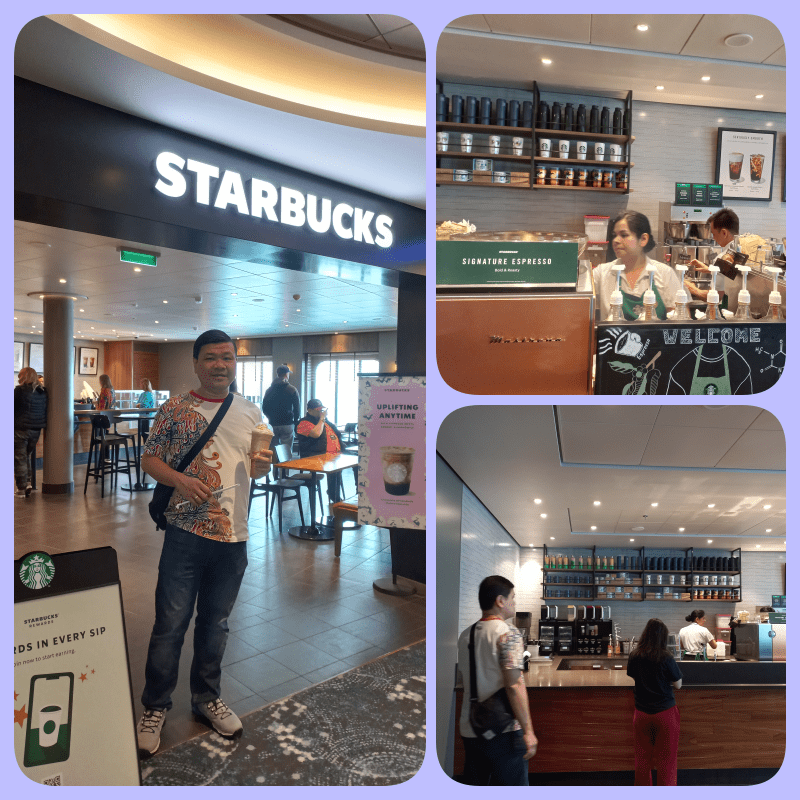 Kali ini breakfast di Taste, mau santai aja sarapannya. Terus kami beli Starbucks di coffee shop nya. Pembayarannya menggunakan kartu kamar dan langsung terhubung dengan kartu kredit kita. Sebetulnya kalo kopi starbucks yang standar kita bisa beli di resto mana saja, tapi kalo mau yang spesial mesti di coffee shop nya. Kami beli yang rekomen, yaitu Caramel Ribbon Crunch Frappucino. Wah, Diana yang ga suka kopi aja lumayan doyan ! Ini pengalaman menarik, beli starbucks di tengah lautan ! Dulu tahun 2018 kami pernah beli starbucks di “the highest starbucks in Canada”, yaitu saat naik gondola di Banff-Canada.