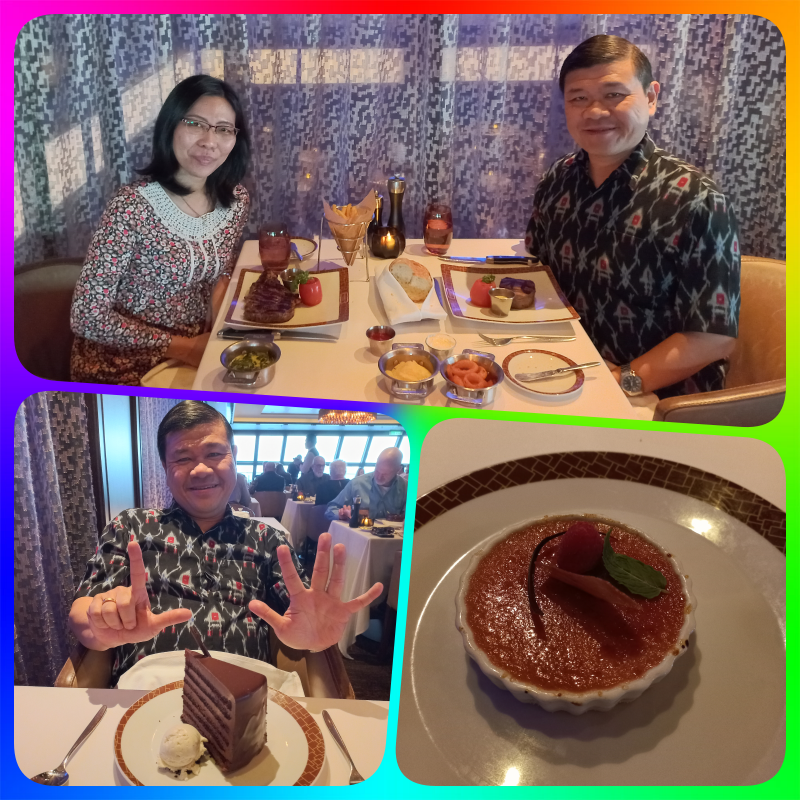 Malam ini, kami dinner di Cagney’s Steakhouse. Ini salah satu resto yang seharusnya berbayar. Namun kami mendapatkan jatah free untuk 1x makan di speciality dining, artinya 1x makan di resto berbayar untuk 2 orang. Boleh pilih di resto mana pun dan boleh digunakan kapan pun. Ada resto yang specialitynya makanan Italy, Jepang, Seafood, BBQ, macem2 deh. Nah, kami pilih yg speciality nya steak, mereka menyebutkan Certified Angus Beef di menu nya, mantap ! Tempatnya cukup ekslusif sehingga ada tamu yang datang dengan baju party yang sangat bagus. Jadi kalo ke resto ini ada dress code nya ya, ga boleh pake sandal atau tank top contohnya.