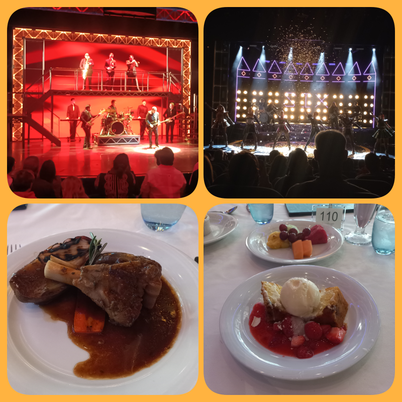 Jam 4.30 pm kami sudah masuk kembali ke cruise untuk beres2 dan mengembalikan passport kami untuk disimpan pihak cruise. Karena lapar dan nanti malam sudah booking nonton show, jadi langsung aja lanjut dinner nih. Pilihannya buffet yang bisa puas makan dan sudah buka di jam 5.30 pm. Jam 9 pm kami sudah masuk ke Bliss Theatre untuk show di jam 9.30 pm. Duduknya siapa cepat dia dapat, jadi masih bisa pilih2 tempat duduk yang strategis nih. Show malam ini adalah British Musical Comedy “Six”. Cerita tentang 6 istri dari Henry VIII. Ini show broadway betulan ya, jadi alur cerita dan performance nya sudah paten dan betul2 spektakuler ! Kalian bisa nonton show ini juga di theatre broadway di luar kapal, jadi beda dengan show di kapal lain yang biasanya show biasa buatan mereka sendiri.