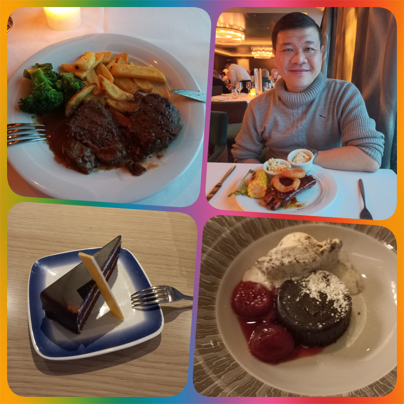 Untuk dinner kali ini, kami memilih resto Taste. Kami sudah booking slot jam 19.30 pm. Jadi kita bisa booking restonya melalui apps untuk memastikan dapat tempat. Tapi kalo mau langsung datang juga boleh, cuma kalo sudah penuh ya mesti tunggu sampai ada tempat kosong atau pindah ke resto lain. Kami antri di depan front desk, tap kartu kamar, dan setelah itu akan diarahkan oleh 1 pelayan ke meja. Setelah duduk, kami diberikan menu yang bisa dipilih mulai dari appetizer, main course, hingga dessert. Mau order berapa banyak pun boleh ya, misal mau 2 jenis appetizernya atau mau nambah dessert nya, silakan saja kalo masih kuat perutnya. Kami langsung pesan yang berat2 nih main course nya, steak dan pork ribs. Wuih, rasanya betul2 enaaaak ! Kualitas dagingnya bagus banget, empuk, juicy.