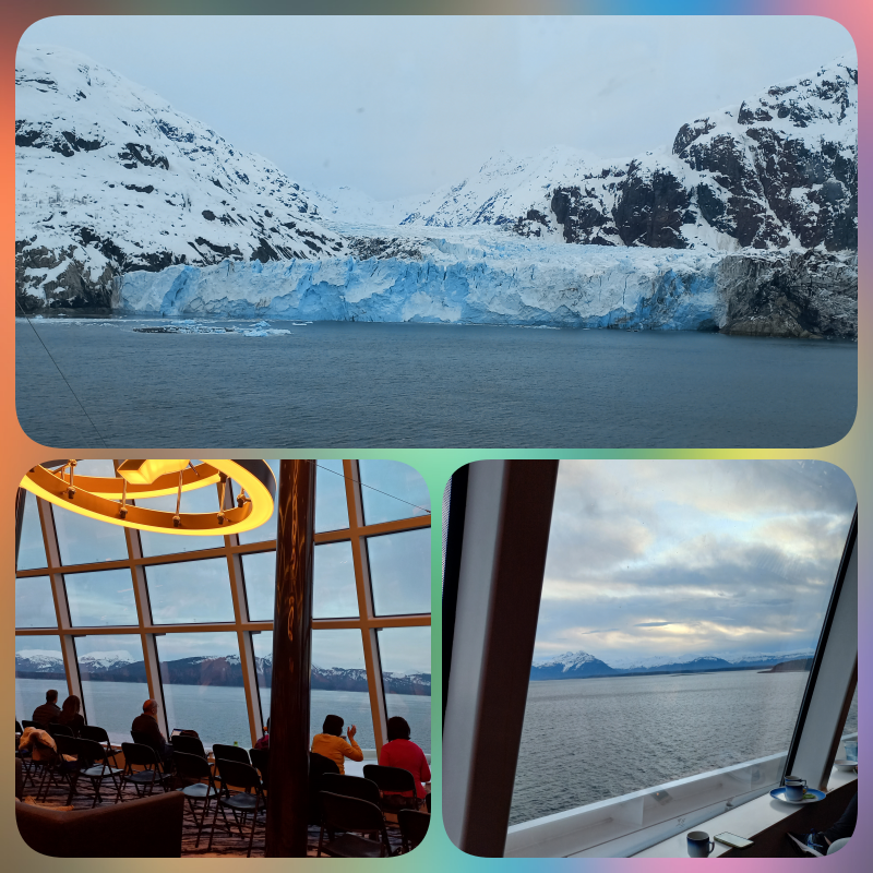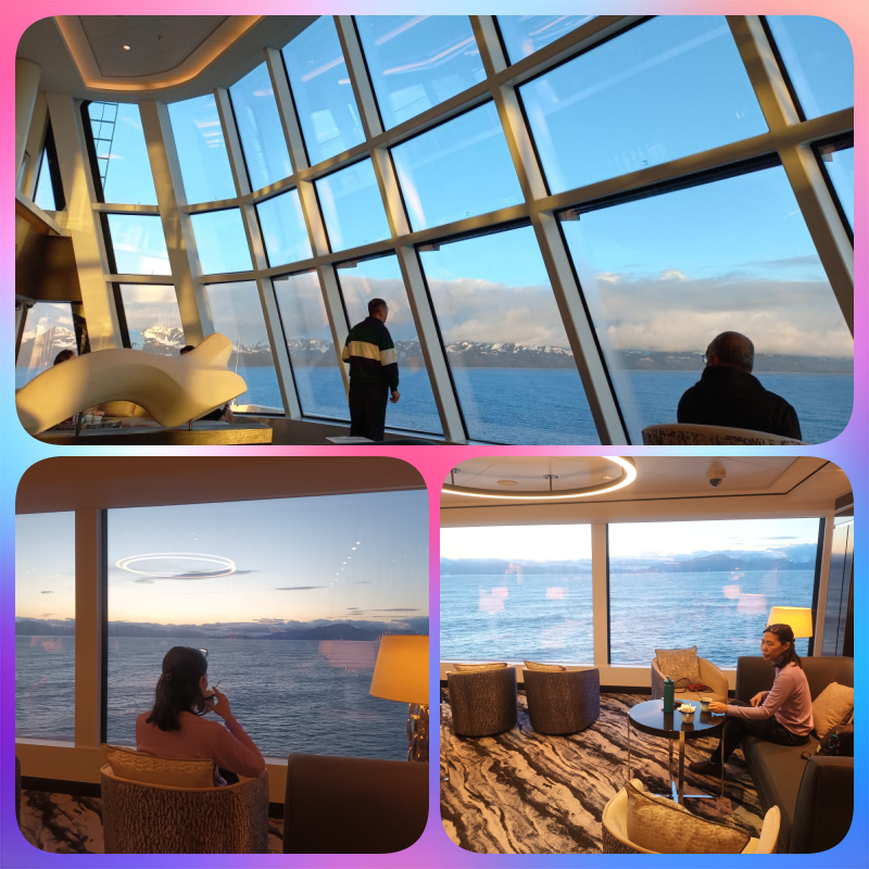 Kami sebelum jam 6 pagi sudah ke Observatorium Lounge, mau breakfast di sini sekalian lihat sunrise. Pemandangan ke arah luar cruise sangat cerah, jadi kelihatan gunung2 es nya. Pagi ini lautnya sudah jauh lebih tenang, perut juga sudah aman, ga mual lagi. Waktunya menikmati perjalanan yang smooth !
