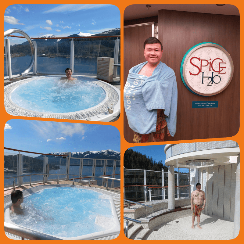 Jam 11 am kami sudah tiba lagi di dalam cruise dan suasana cruise masih sepi karena tamunya masih jalan2 di kota. Cuaca yang cerah membuat Jeff tertarik untuk jacuzzi. Kapan lagi jacuzzi di atas cruise dengan pemandangan Alaska. Agak uji nyali juga sih ini, karena di tengah cuaca yang dingin nya sekitar 5 derajat, musti buka baju….brrrr… Diana sih ga mau cari penyakit ya ! Ini aja Diana pake baju 3 lapis dengan jacket tebal loh.