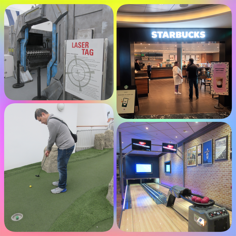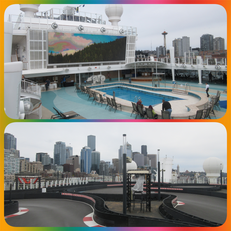 Yang tidak basah di area outdoor ada banyak kursi santai, mini golf, gokart (berbayar), laser tag (berbayar), ada juga layar besar di area swimming pool bisa buat nonton film. Sering juga menampilkan video tentang alam Alaska yang keren2. Di seputar kapal ada track untuk jogging juga sih. Nah, sejauh yg kami tau, hanya NCL yang punya circuit balapan gokart terbuka di atas kapal. Untuk main ini orang sampai antri2 daftarnya loh, punya sensasi tersendiri ya !