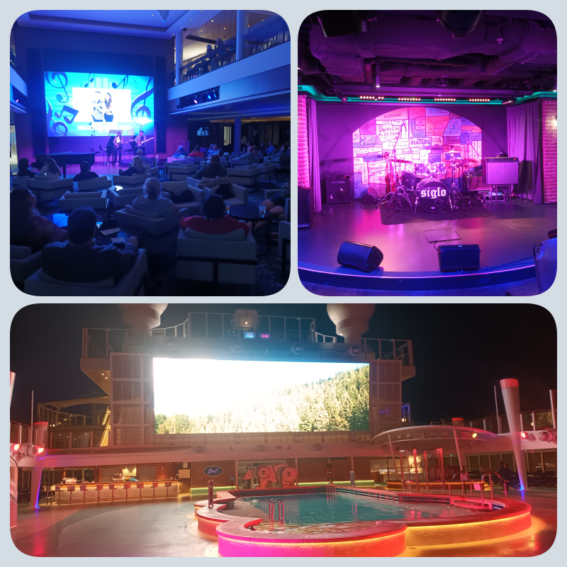 Kenyang makan, kami keliling cruise untuk melihat aktivitas yang ada di malam hari. Kolam renangnya sudah ditutup tapi bisa duduk2 santai kalo mau, banyak lampu2 di area pool ini. Hiburan di kapal ini banyak dan tersebar di berbagai area. Bisa lihat saja jadwal2nya di booklet. Ada club yang menampilkan The Beatles, bisa juga duduk di Atrium untuk lihat performance nyanyi, dance, dan macam2.