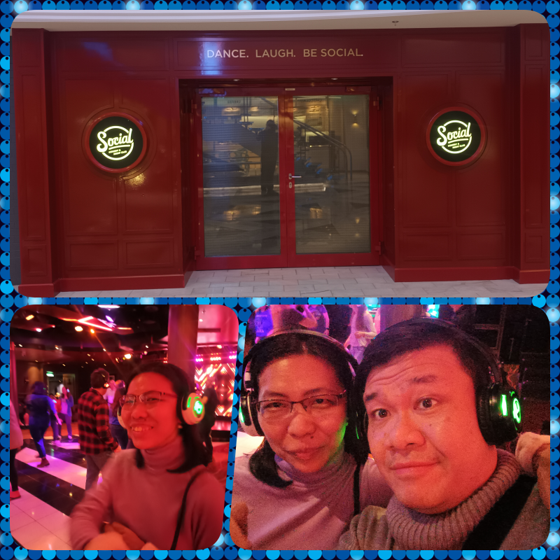 Malam ini kami mau mencoba sesuatu yang menarik yaitu Silent Disco di The Social. The Social ini adalah satu club di cruise, tempat hiburan malam yang ada DJ nya. Nah, karena namanya Silent Disco, jadi suasana clubnya sunyi, ga ada musik yang terdengar. Jadi para tamu akan menggunakan headset masing2, dari situlah musiknya terdengar. Musik yang terdengar di headset pun berbeda2 tergantung kita berdiri di posisi mana, lucu ya. Jadi pada saat yang sama, orang di depan bisa dengar musik A, sementara orang di belakang bisa dengar musik B. Jadi kita bisa muter2 dulu, cari musik yg cocok, haha.. Nanti musiknya juga akan ganti2 ya, ga berarti di 1 posisi musiknya akan sama terus.
