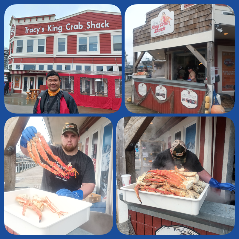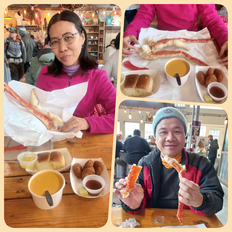 Sekitar 1 jam kami main2 salju di atas, saatnya turun lagi nih. Wah, antri lagi rupanya. Oke deh..ikuti saja. Begitu tiba di bawah, kami langsung antri untuk makan di Tracy’s King Crab Shack. Ini restoran crab paling terkenal, jadi penasaran nih. Mereka menyediakan Alaskan crab yang terkenal itu, dengan harga yang normal sesuai pasaran dan katanya enak banget karena fresh. Sudah ke Alaska, masa ga nyobain Alaskan crab nya sih ?
