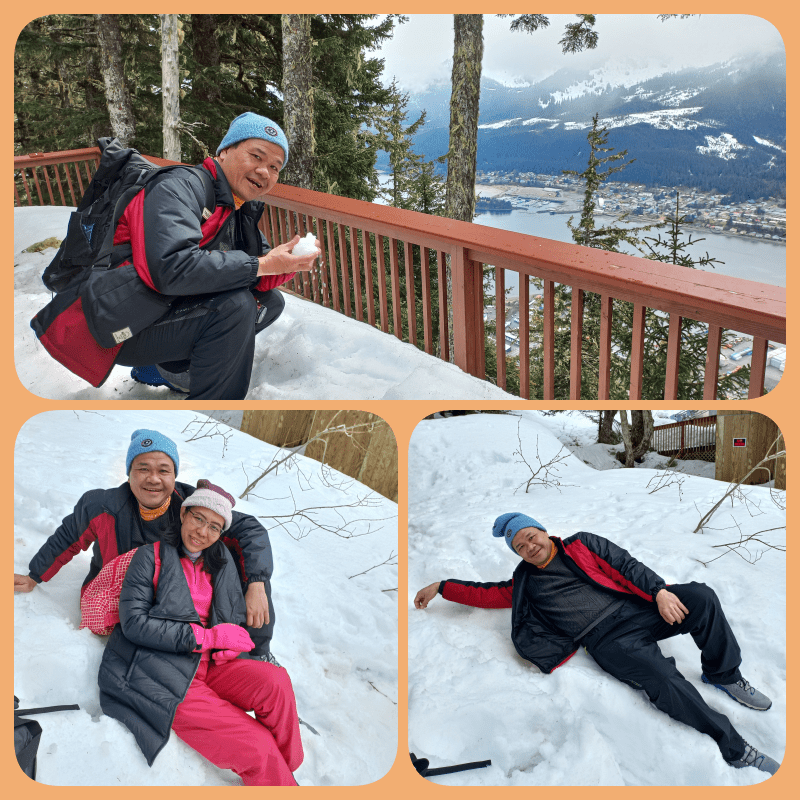 Waaaah… pengalaman pertama buat Jeff nih ketemu salju. Buat Jeff yang pertama pegang salju, ternyata salju itu kaya es serut, ringan, empuk. Nah kalo salju lama yang sudah membeku itu jadi kaya es batu. Yang mau lebih jelas terkait perbedaan salju dan es serta serba serbi pakaian yang pas untuk salju, bisa lihat postingan tentang perlengkapan winter untuk suhu minus ekstrim. Untuk musim semi tapi suhu dingin dan salju seperti di Alaska ini, tinggal disesuaikan saja ya. Senang banget Jeff pegang2 salju pakai tangan langsung. Dingin sih, tapi sensasi nya seru !